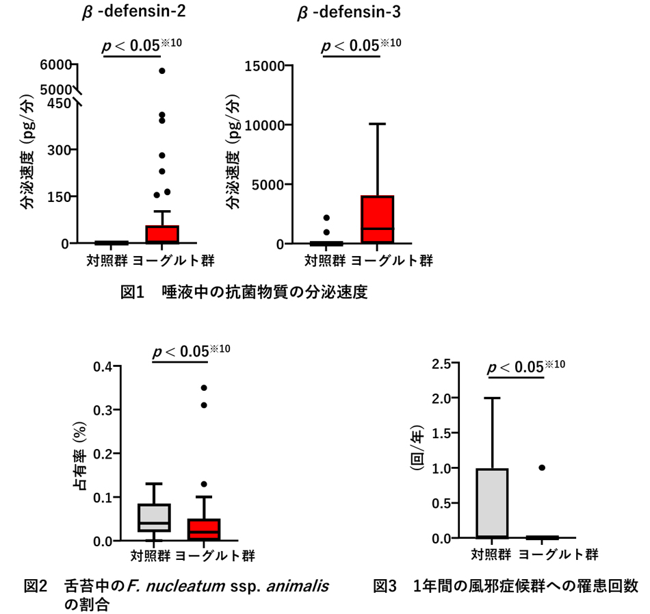 OLL1073R-1株とOLS3059株で発酵したヨーグルトの継続摂取者は非摂取者と比べて、唾液中のβ-defensin-2※3、β-defensin-3※3の分泌量が多く、大腸がんとの関連が知られるF. nucleatum ssp. animalisの舌苔中の割合が低いことを確認しました。