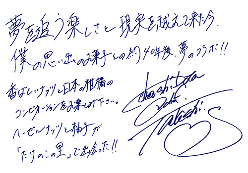 柴田シェフと「たけのこの里」の出会いから約40年、時を超えて実現したコラボレーションとして、香ばしいナッツと柚子のコンビネーションを楽しめる味わいに仕立てていただきました。チョコレート部分は2層構造で、「たけのこの里」ならではのカカオ香るチョコレートと、ヘーゼルプラリネに柚子を合わせたチョコレートを使用しています。チョコレートとクッキー部分にはロレーヌ岩塩も配合し、クセになる味わいです。※2