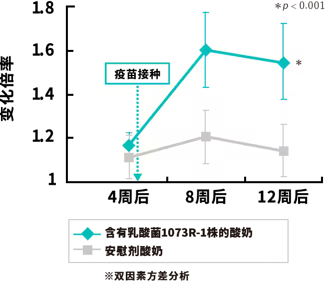 其结果,每天饮用含乳酸菌1073R-1株的饮用型酸奶者,与饮用未发酵酸性乳饮料(安慰剂)者相比较,在以18-25岁的男大学生为对象的试验中,对甲型(H3N2)和乙型流感;在以25-59岁的男女为对象的试验中,对甲型(H1N1)和乙型流感所产生的抗体效价高,显示了与往常不同的推移曲线。可以认为,含有乳酸菌1073R-1株的酸奶,起到了提高接种流感疫苗后产生抗体效价的佐剂(※)作用,有提高流感疫苗效果的可能性。