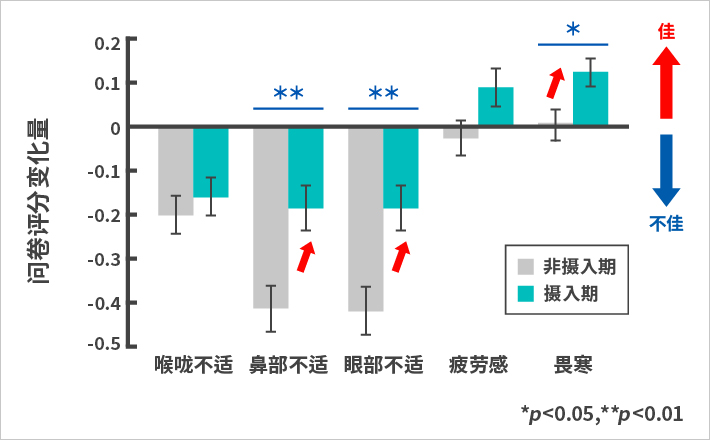 通过摄入含乳酸菌1073R-1株的酸奶,(有统计学意义地)显著改善了鼻部/眼部不适与畏寒症状