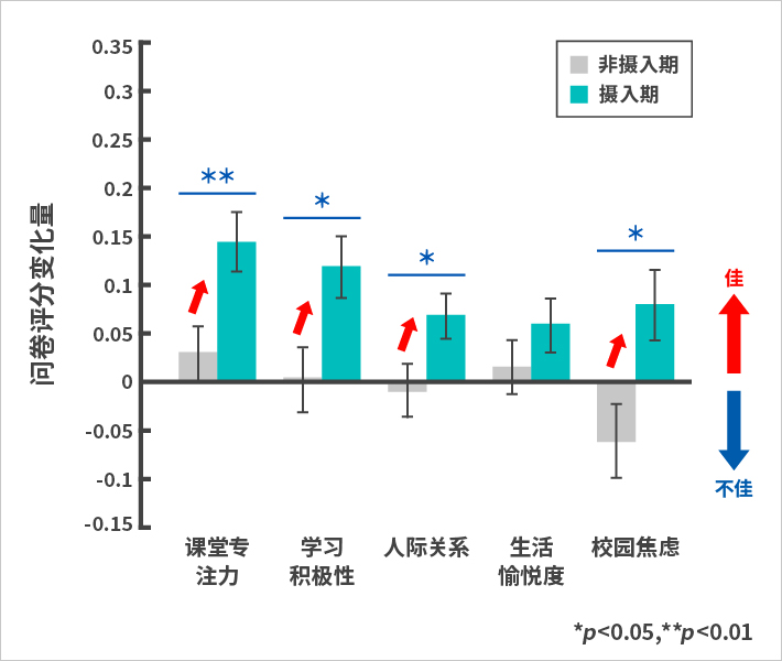 摄入含乳酸菌1073R-1株的酸奶后,课堂专注力、学习积极性、人际关系处理及校园焦虑情绪均获有统计学意义的显著改善