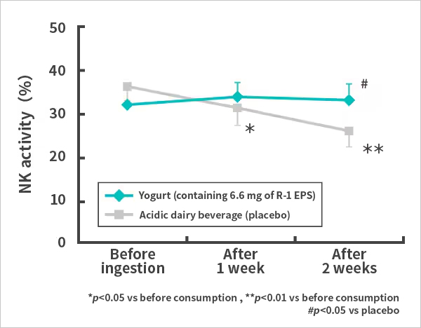 Findings from OLL1073R-1 and OLS3059 lactic acid bacteria research(6)Yogurt fermented with OLL1073R-1 and OLS3059 lactic acid bacteria has been confirmed to potentially suppress the temporary decline in immunity (NK activity) and maintain good physical conditions in subjects at high risk of immune dysfunction (human study conducted in male university track-and-field athletes (healthy individuals) aged 18 to 25 in 2012).This study demonstrated that it is effective in maintaining normal immune function even in people at high risk of weakened immune function. In addition, consuming yogurt fermented with OLL1073R-1 and OLS3059 lactic acid bacteria is thought to be effective in maintaining systemic homeostasis and good physical condition through suppressing the temporary decline of intestinal function and the abnormal amino acid metabolism. This result was found for the first time thanks to the fact that 6.6 mg of R-1 EPS was ingested, twice as much as in previous studies. Risk of weakened immune functionDecline in immune function is thought to increase the risk of developing a variety of infectious diseases*1 and to be related to poor physical and psychological conditions*2. While there are various causes of the decline in immune function such as aging, it is also known that irregular lifestyles and strenuous exercise are risk factors. It is also reported that strenuous exercise may damage the intestinal tract and impair protein digestion and absorption*3. In order for athletes to stay in good physical condition, it is critical to maintain normal immune function and not to allow blood levels of essential amino acids to decrease, as these help repair post-training muscle damage*4.