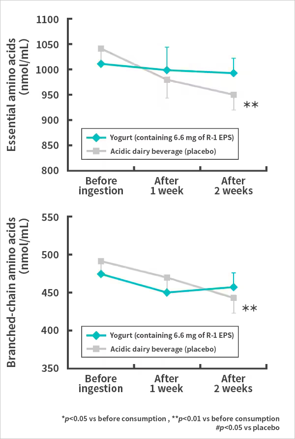 Fluctuations in NK activity and blood levels of amino acids18 male long-distance runners and 13 male throwers in a university track-and-field club were randomly divided into two groups without unbalanced distribution, one of which consumed yogurt fermented with OLL1073R-1 and OLS3059 lactic acid bacteria (containing 6.6 mg of R-1 EPS), while the other consumed an acidic dairy beverage (placebo) for 2 weeks. The athletes were subjected to strenuous exercise in a weeklong training camp during those 2 weeks. The primary endpoint of this study was NK activity. Fluctuations in NK activity (Figure 1) ![]() Fluctuations in blood levels of amino acids (Figure 2) ![]()