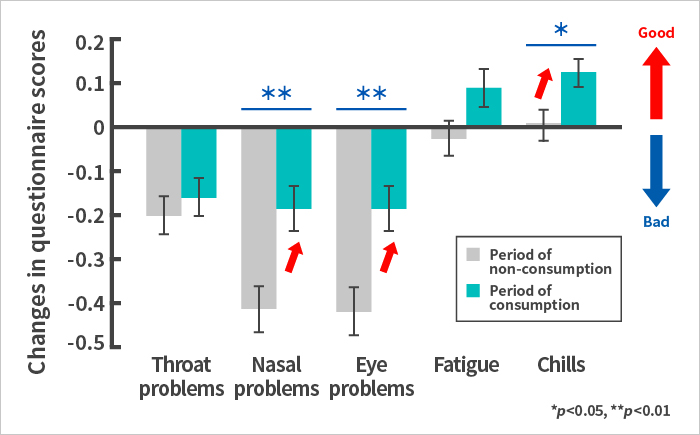 Consumption of yogurt fermented with OLL1073R-1 and OLS3059 lactic acid bacteria significantly improved nasal and eye problems and chills.Results of questionnaire on physical conditions ![]() Consumption of yogurt fermented with OLL1073R-1 and OLS3059 lactic acid bacteria significantly improved concentration in class, motivation to learn, interpersonal relationships, and irritability at school.Results of questionnaire on physical conditions ![]()
